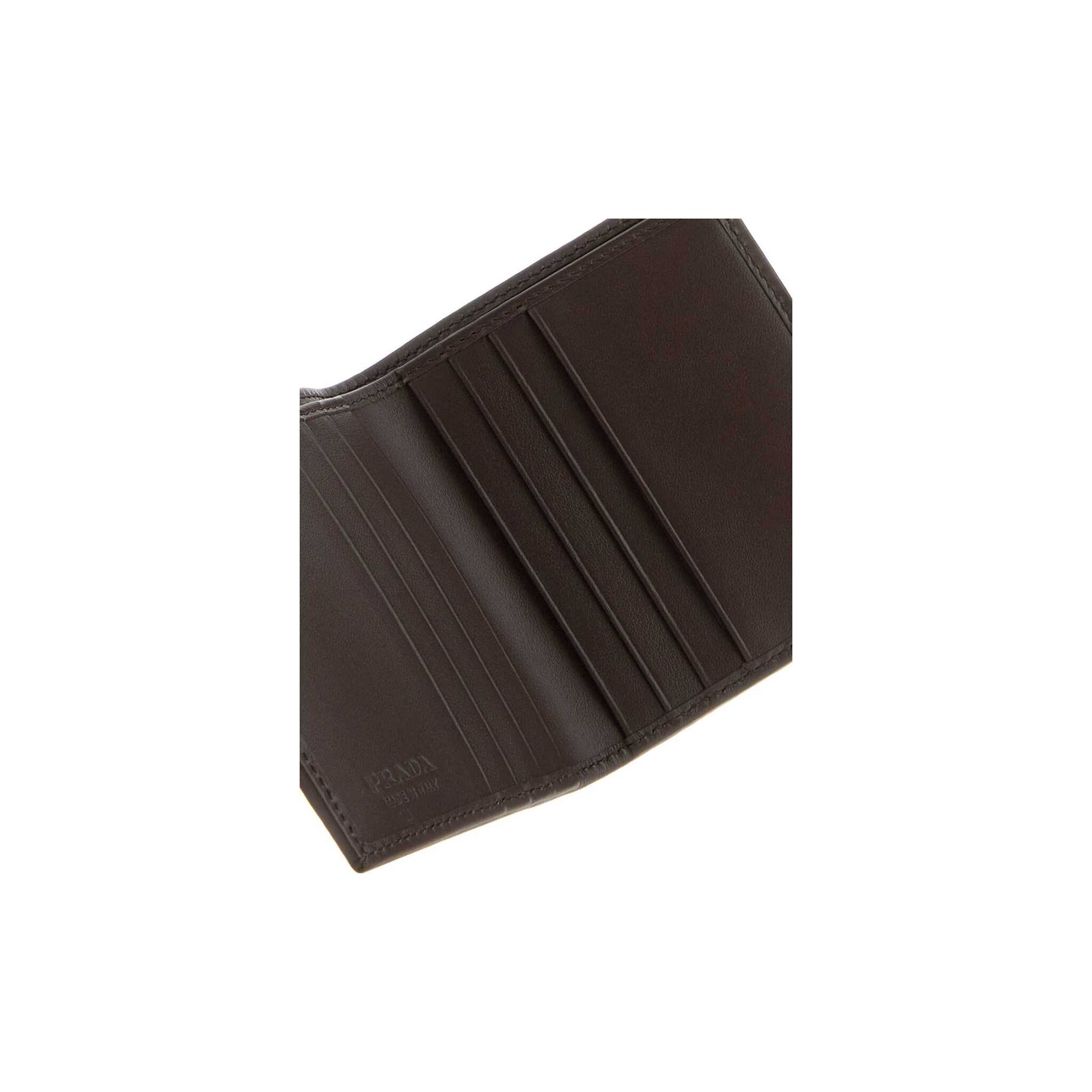 The Prada wallet in fabric e scamosciata is organised around a simple idea: everything in its place, nothing out of view. The fabric e scamosciata exterior firms up with use, and the interior layout handles cards, notes and coins without overlap — a pocket archive of daily life.