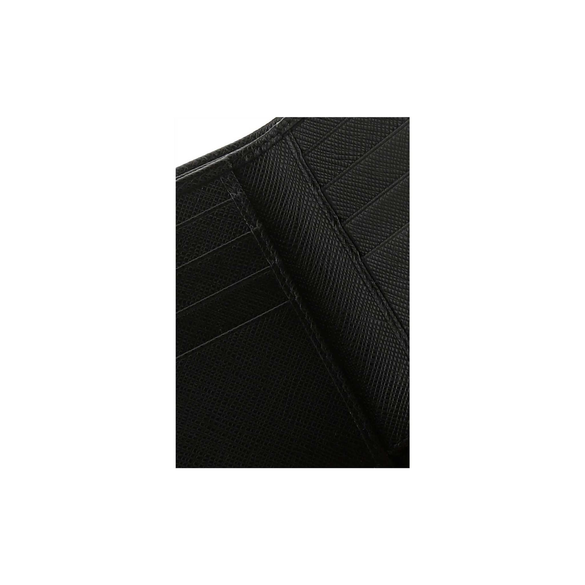 A carteira Prada em Pele Saffiano traduz a lógica minimalista da maison: nada que sobre, nada que falte. A textura do Pele Saffiano firma-se entre os dedos com a densidade certa, e a organização interior distribui cartões, notas e pequenas moedas sem sobreposições — tudo no sítio certo.